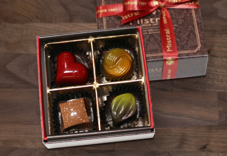 フランボワーズ、柚子蜜柑、抹茶、プラリネ、アーモンド、アールグレーが1個づつ入った、宝石箱のようなボンボンショコラ計6個入のセットです。